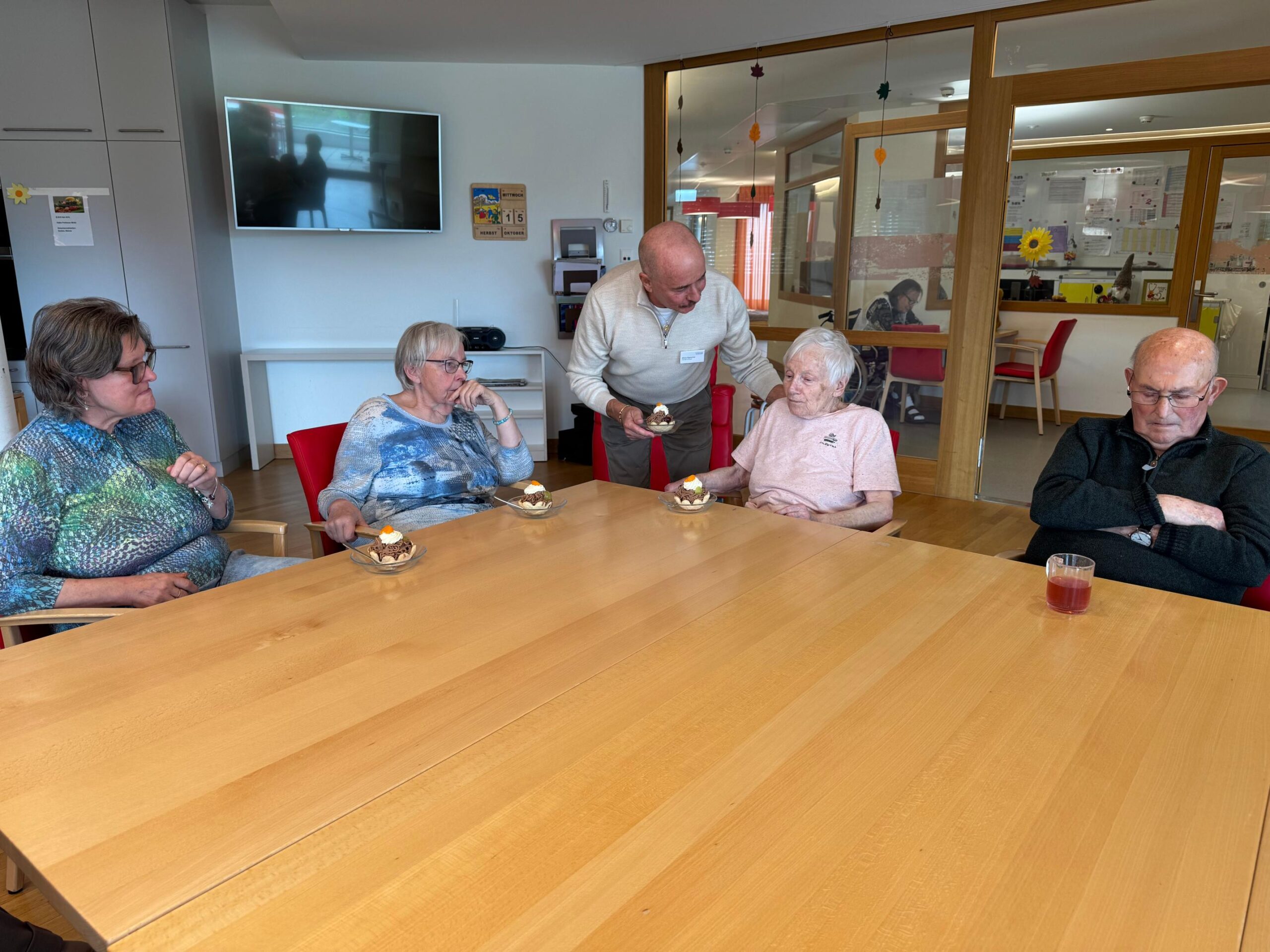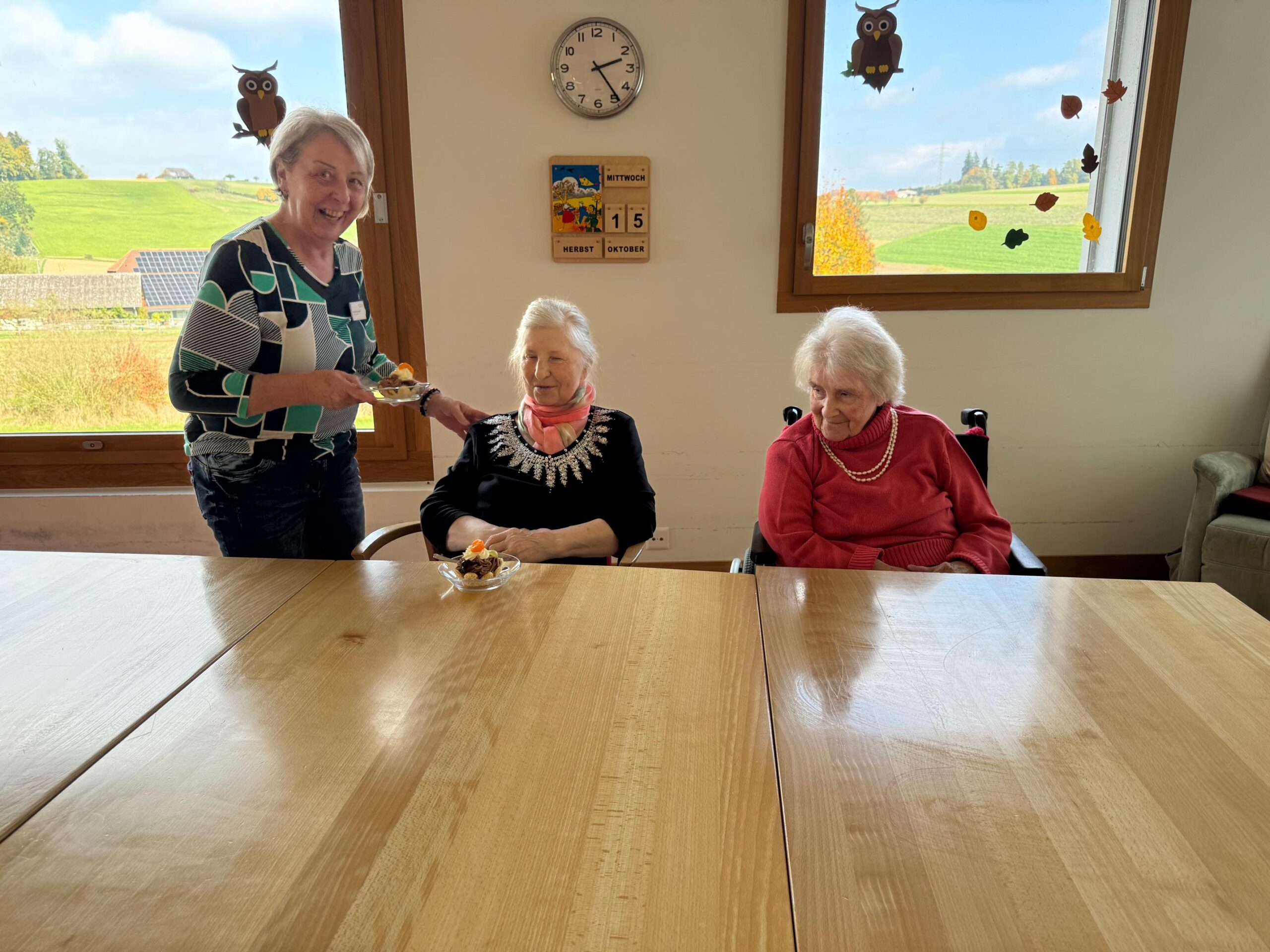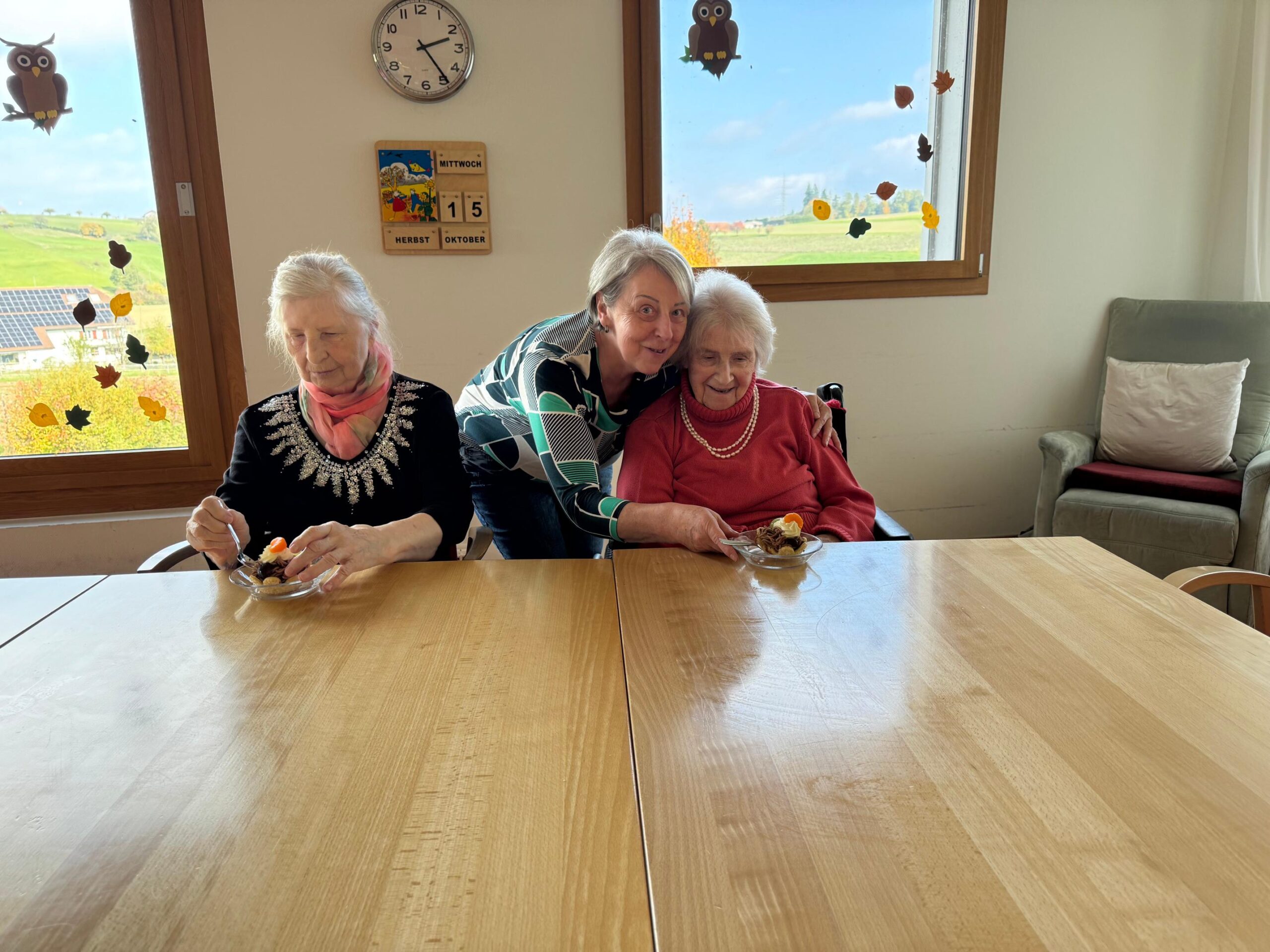 Mit einem feinen Herbstgruss wurden die Bewohnenden überrascht. Die Vermicelles wurden vom Sennhofverein gespendet und durch die freiwillig Tätigen begeistert verteilt. Das anschliessende gemeinsame Dessertessen sorgte für Abwechslung im Alltag und brachte Glücksmomente in den Raum.